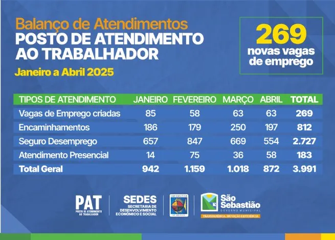 São Sebastião - SP Prefeitura de São Sebastião registra mais de 3.900 atendimentos e quase 270 vagas de emprego criadas neste primeiro quadrimestre